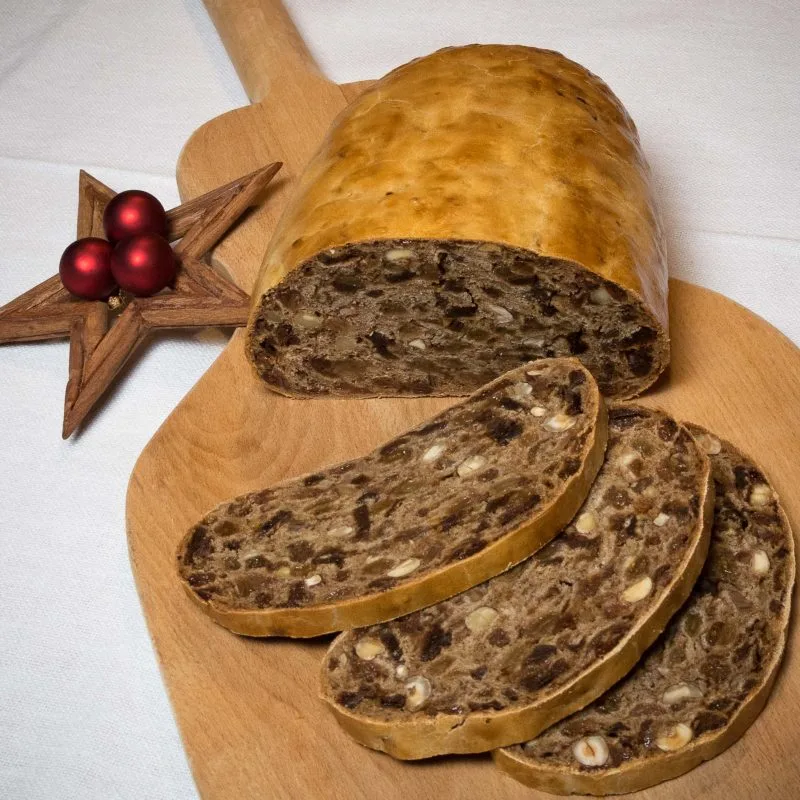Für die Fülle die Birnen ca. eine Stunde in heißem Wasser einweichen, anschließend fein schneiden und mit den Rosinen, den geschnittenen Feigen und den Nüssen vermischen. Den Saft der Orange, den Rum und das Zeltengewürz ebenfalls zur Menge geben. Die fertige Fülle einen Tag ziehen lassen.