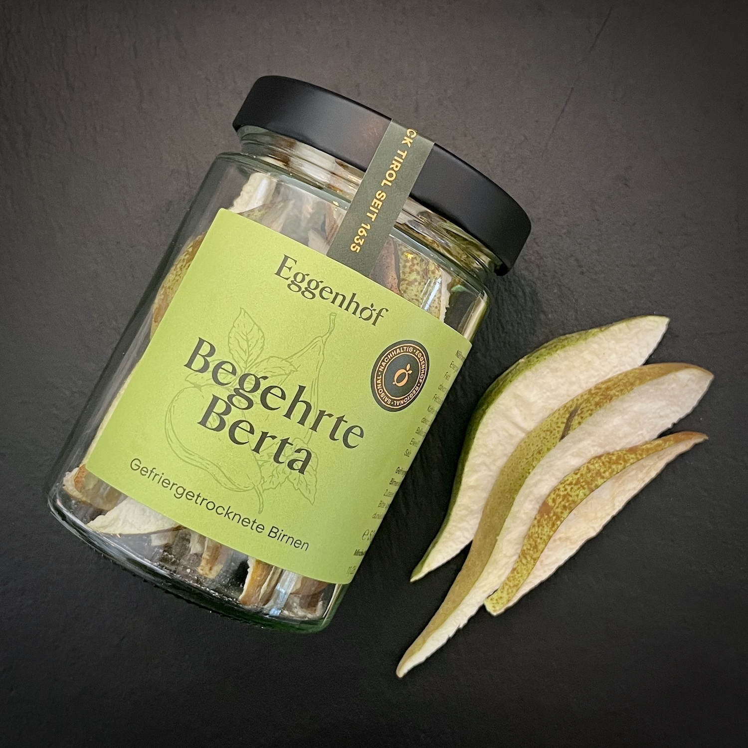 Die frischen Birnen wachsen und reifen im Tiroler Inntal. Geerntet werden sie zum optimalen Zeitpunkt, um dann bei uns am Eggenhof zu knusprigen Köstlichkeiten verarbeitet zu werden.