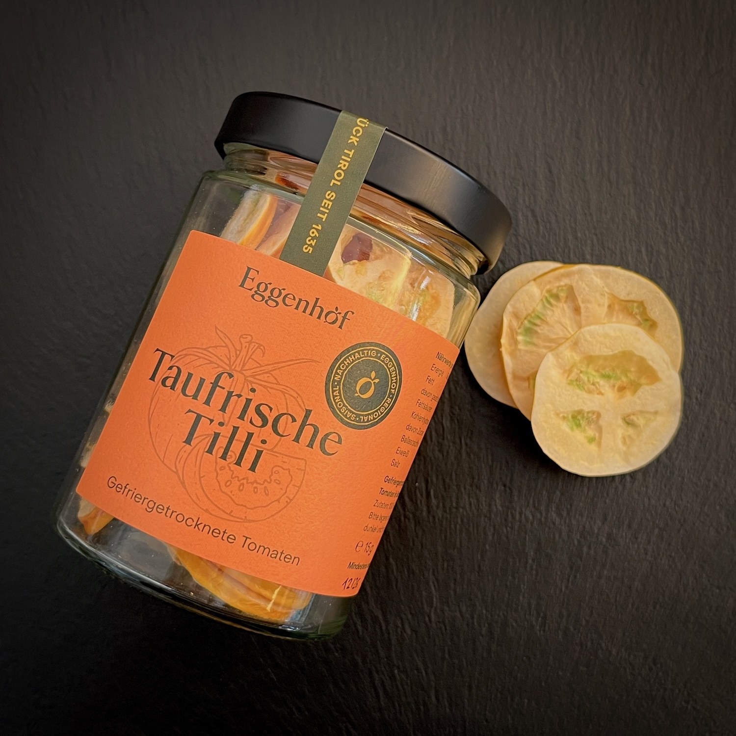 Für die Taufrische Tilli werden ausschließlich Tomaten aus Österreich verarbeitet. Bei der Auswahl der Sorten liegt das Augenmerk auf Geschmack sowie Qualität. Die gefriergetrockneten Tomatenscheiben werden rein händisch verarbeitet. Das ermöglicht die wunderbare Optik sowie den intensiven Geschmack.